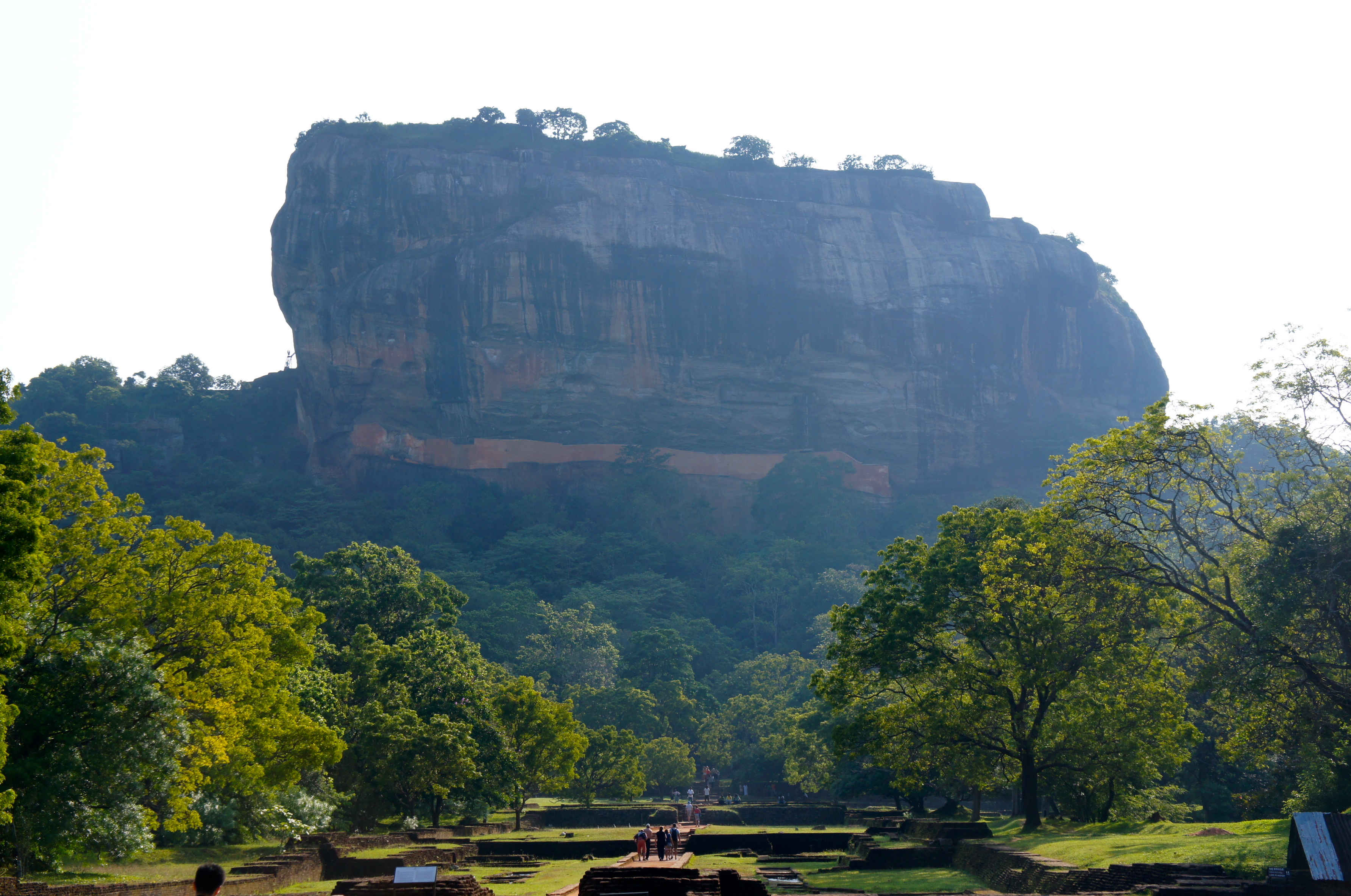 Our climb continues up more stone stairs and we reach a landing with a gorgeous view below and a glimpse of a standing Buddha in the distance, presumably blessing the rock. Immediately below us is another cool terrace garden that looks perfectly serene overlooking the green treetops. After another steep set of stairs we find ourselves on a larger landing marked by the giant stone paws of a lion. Sigiriya’s other name is Lion Rock and when the palace here was at its full glory, visitors had to reach the summit via a staircase leading between the lion’s paws and through its mouth. I wish I could have seen that. Instead, we see another metal staircase, steeper than any we’ve climbed so far. We trudge upward, taking slow steady steps and I start to feel the sweat popping off my brow, my breathing getting more and more labored. But I don’t stop for fear that it will be hard to start again. The stairs are barely wide enough for a stream of ascending tourists to pass the descending ones and everyone has a tight hand on the railings. After making it up an almost vertical set of steps, I want to have a Rocky moment when we get to the top and hop around with my arms over my head in victory, but I’m too tired. Not too tired to notice that it is beautiful here, though. We catch our breath as we walk along ruddy stone walls that may have been palace walls. You absolutely feel royal, looking across the lush Sri Lanka landscape. Signs mark the palace grounds and Kassapa’s throne. Where there aren’t terraces of stacked red bricks there are flat grassy plateaus and languid pools of water. After wandering and wondering how such a place could have been constructed, we start our descent. Sid thinks lots of people probably died while building the place and I am a reminded of the Great Wall in China where its deceased construction workers were buried in its walls. We suspect something similar must have happened here, or they just fell to a grassy grave. Not a happy thought as we make our way down a sheer rock face. Our descent is slowed by a small group of young women in tank tops and shorts, one of which appears to be terrified of heights. Her face is bright red and she is sweating and holding on to the metal railing for dear life while taking each step downward gingerly. She is as much afraid of holding up the people behind her as she is of climbing down, but we tell her that it is OK and to take her time, hoping to put her at ease. Once secure on a sturdy landing, the women stop to take a break and allow their friend to rest. We find out that they are student from the UK and Australia. I know this must have been a life-changing experience for at least one of them.