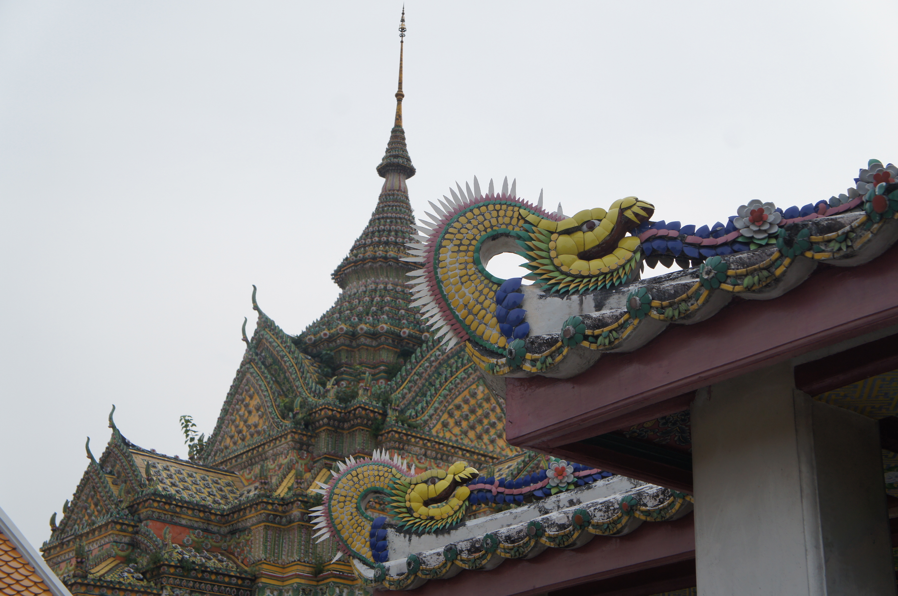 Beyond this room, there is an open air pavilion full of amulets or charms for purchase to be left for Buddha next to tables full of lottery tickets also for purchase. Old lottery tickets have been turned to hats and other decorative items. Inside the temple, we can see that donations of devotion have gone toward a gorgeous marble floor filled with dancing fish to represent the sea and a celestial painted ceiling representing the sky with a cluster of gold leafed deities sitting cross-legged below. J.J. explains that the knotted or curly tresses of each comes from Greek representations of Buddha that have been carried into Thai images of the man turned god. We also learn that his long earlobes represent long life.