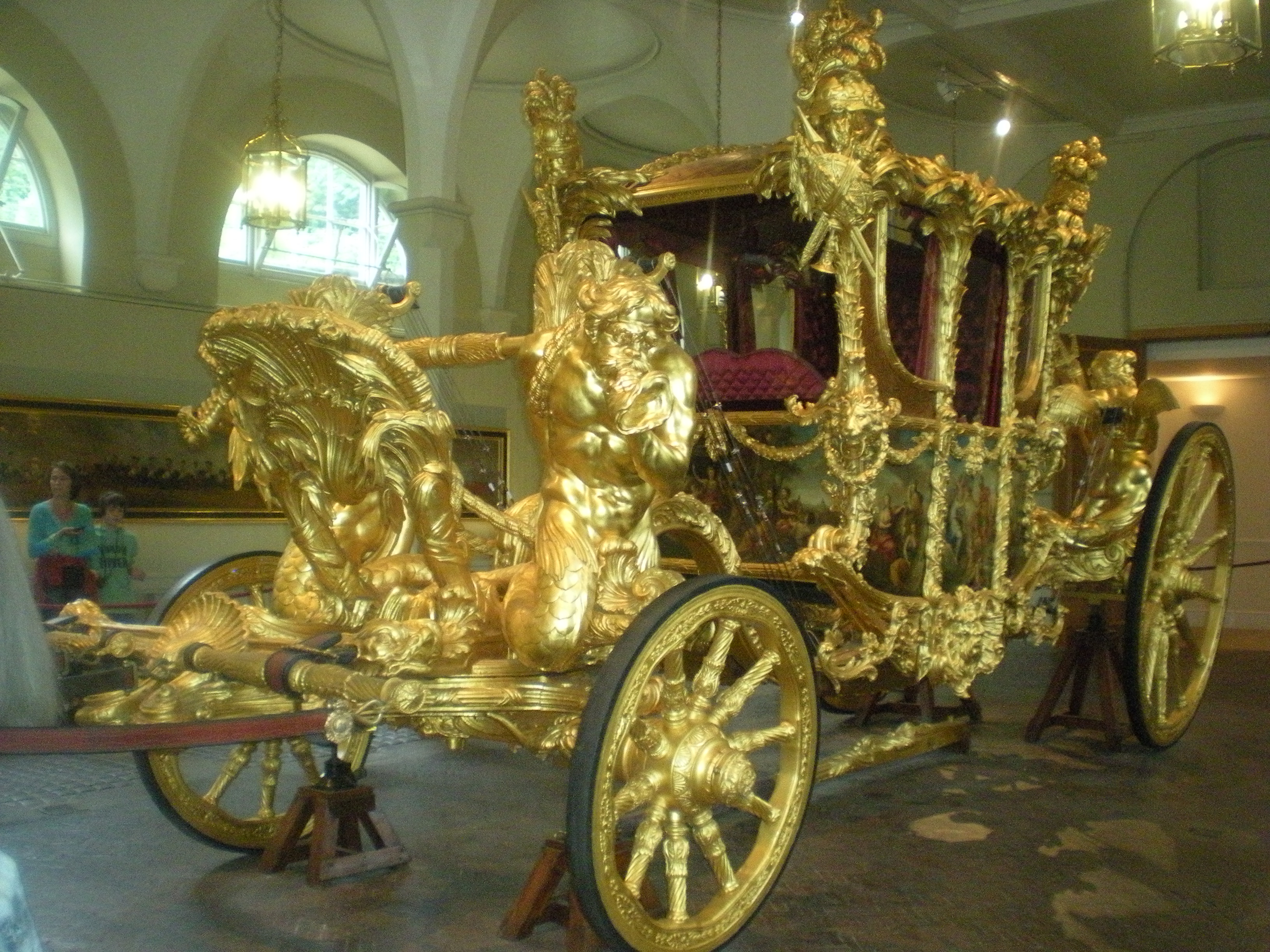 There is plenty of pomp and circumstance at the Royal Mews, the working stables of the palace. The horses snack on hay as we pass through to see the carriages, which are definitely something out of a fairytale, each used for different occassions. One is for the Queen to ride in to open Parliament and another just carries her lighted crown for all her British subjects to view. Then there is the royal Bentley which was built for her to stand up in. Naina and I guess that the Queen must be 4’2, because it doesn’t look like an average-sized person, let alone a petite 5-foot person like me, could stand up in the vehicle. The most ostentatious thing we have the pleasure of laying our eyes on is the Golden State Coach, which weighs 4 tons and can only go about 10 miles per hour with six horses pulling it. It is baroque with a capital B. I like to think of it as the royal pimp mobile. It is only used for the most special of occassions like coronations, most recently for the Queen’s Golden Jubilee celebration. Only the pictures can do it justice. The tour ends with the carriage that carried William and Kate to Buckingham Palace after their nuptials at Westminster Abbey in April.